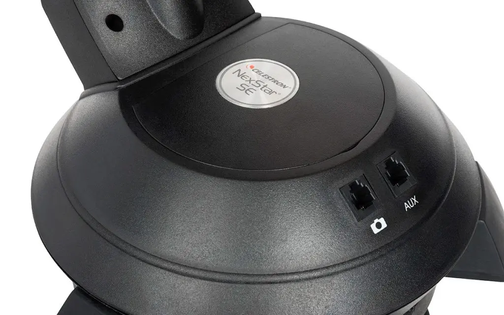 En la base del telescopio NexStar verás dos puertos de conexión, el puerto AUX es para conectar accesorios super interesantes que llevarán el telescopio a otro nivel.