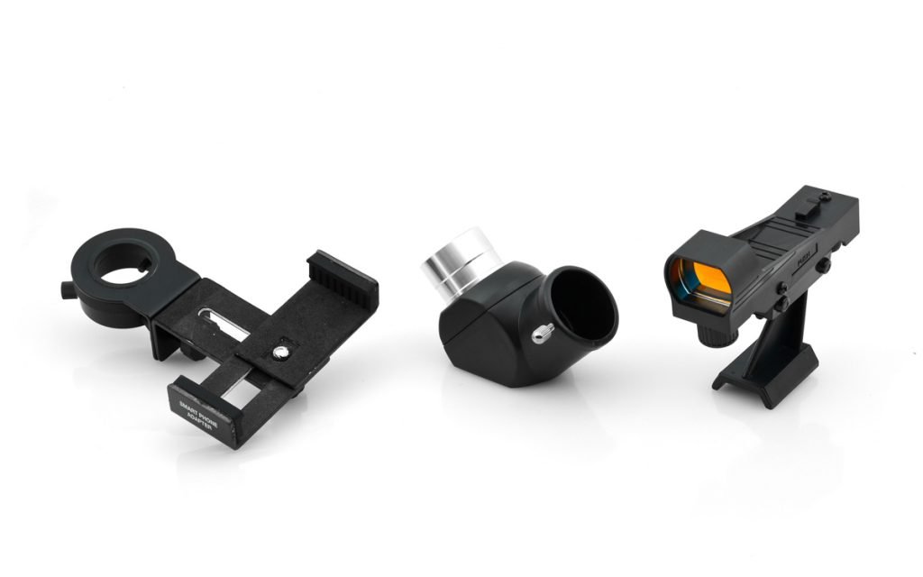 Todos los modelos de la serie incluyen el mismo trípode extensible de aluminio con cerrojos de seguridad en color azul y con una bandeja de accesorios plástica que posee seis perforaciones en las que puedes alojar tus oculares o lentes de Barlow durante la observación.